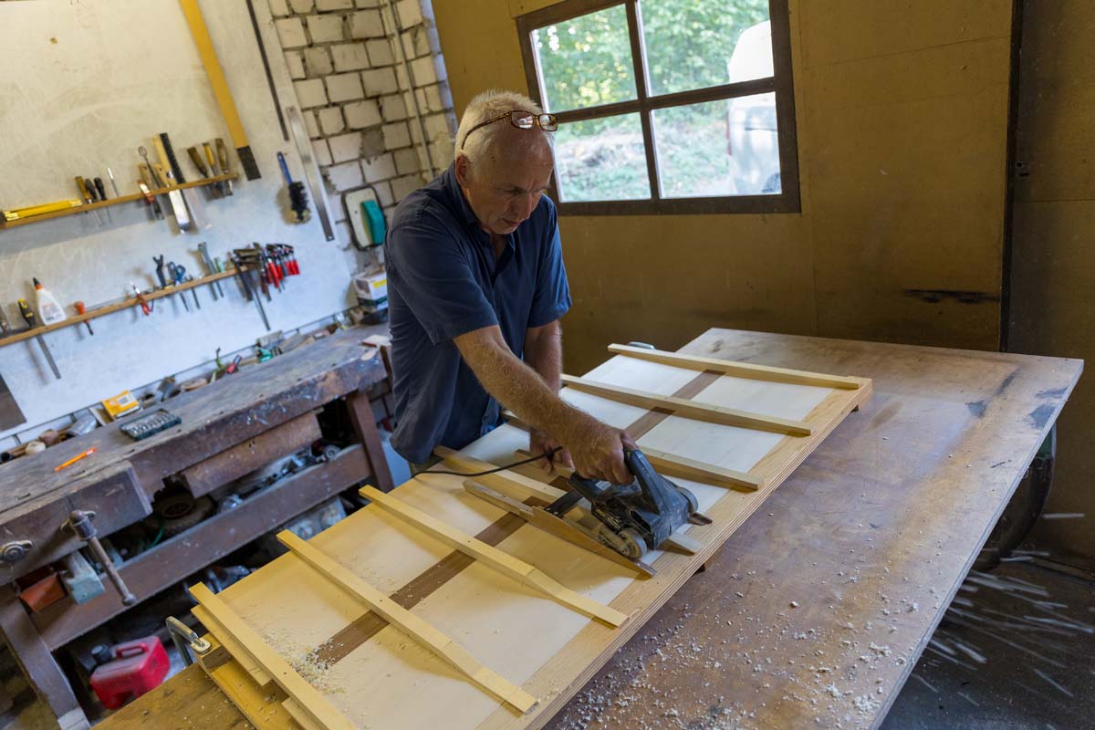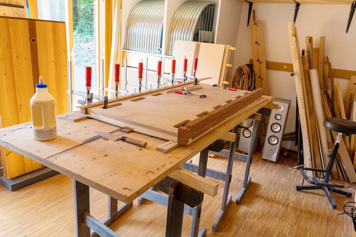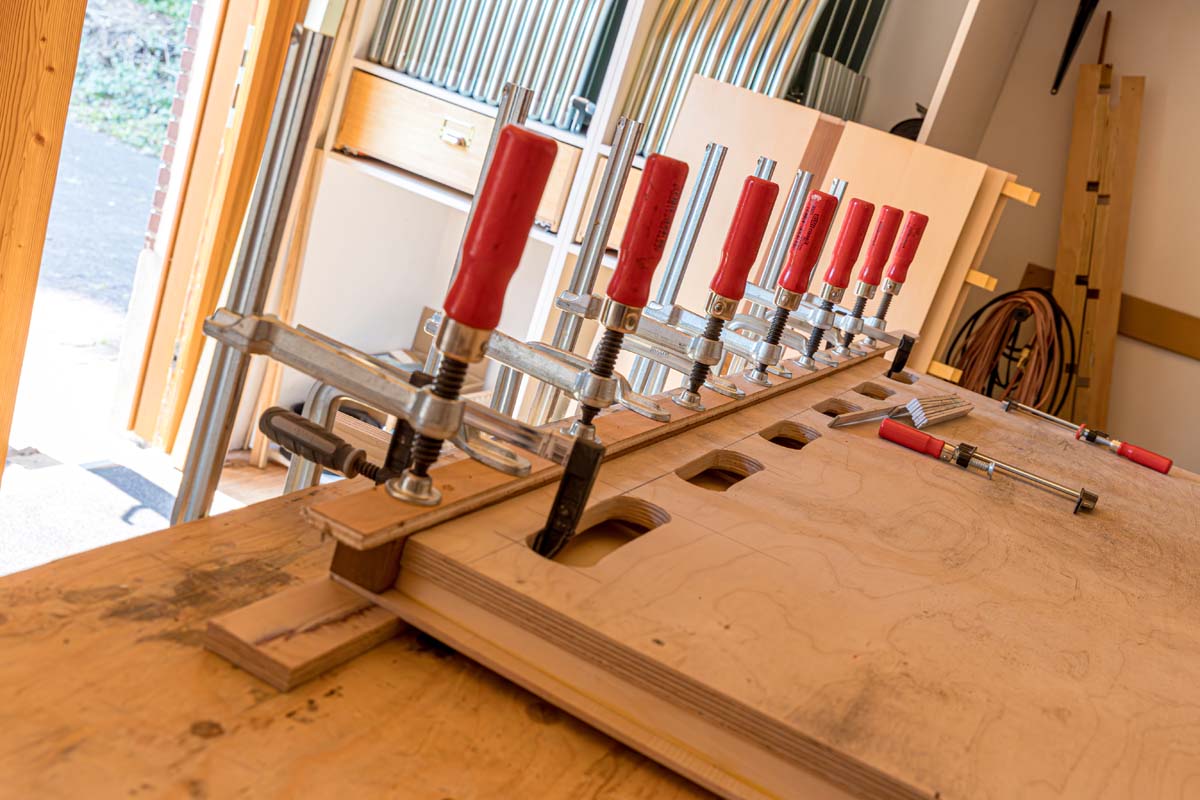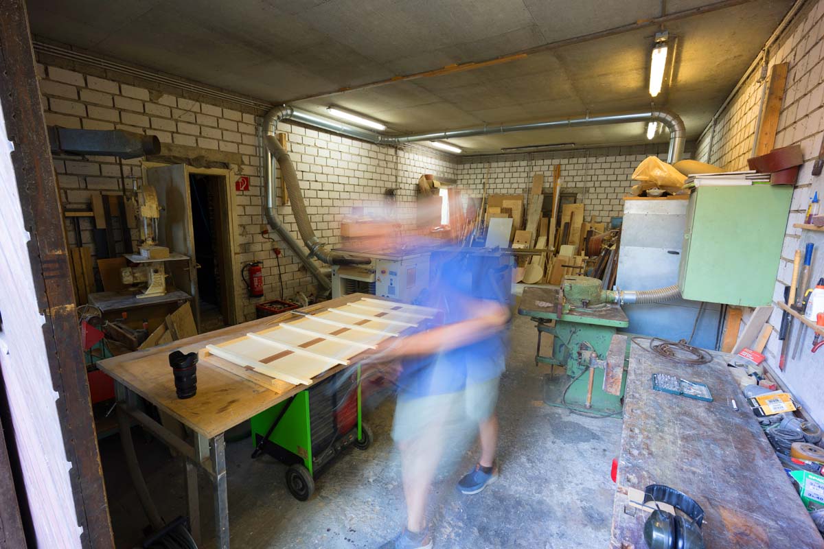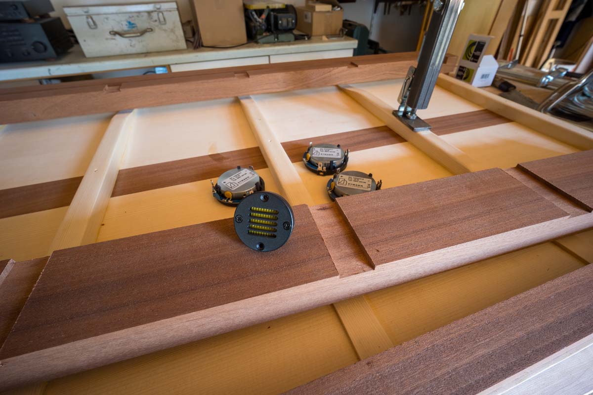 Im nächsten Zimmer erblicke ich schließlich die DSB-136, beziehungsweise eine ihrer Schallwände. Die drei Holzpaneele, aus denen jede Wand zusammengesetzt wird, sind bereits verleimt, und auch die innenliegenden Rippen sind aufgebracht und verleihen der Konstruktion die markante Wölbung. Um sie in das Material hineinzuzwingen, verpasste der Handwerker seiner Werkstatt ein selbst erdachtes gelochtes Deckenelement. Dort setzt er zur Demonstration des Prinzips eine lange Holzstange an, zielt auf eine der Rippen und (Zapp!) drückt ein ausgelöster Schnappmechanismus das Holz mit unglaublicher Kraft nach unten.