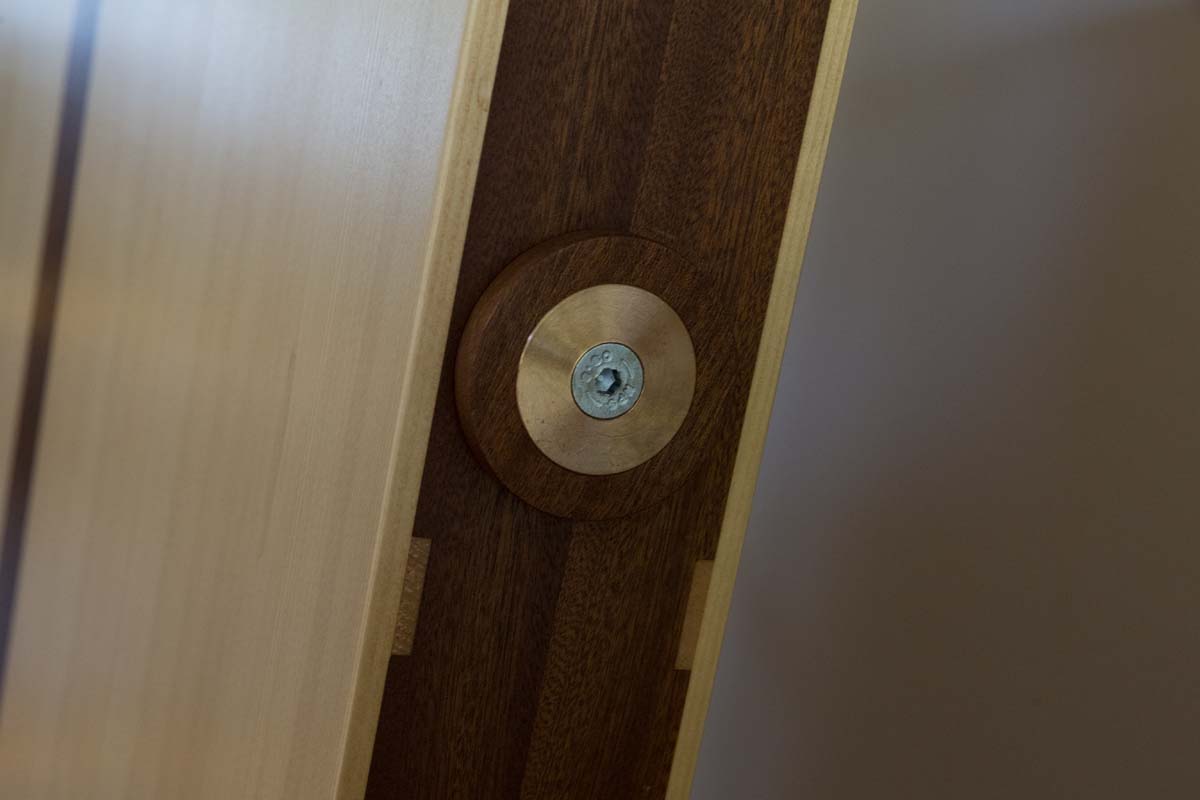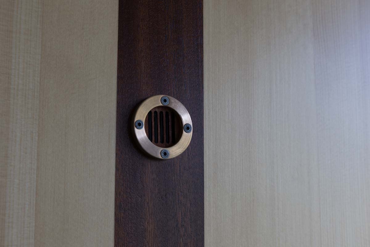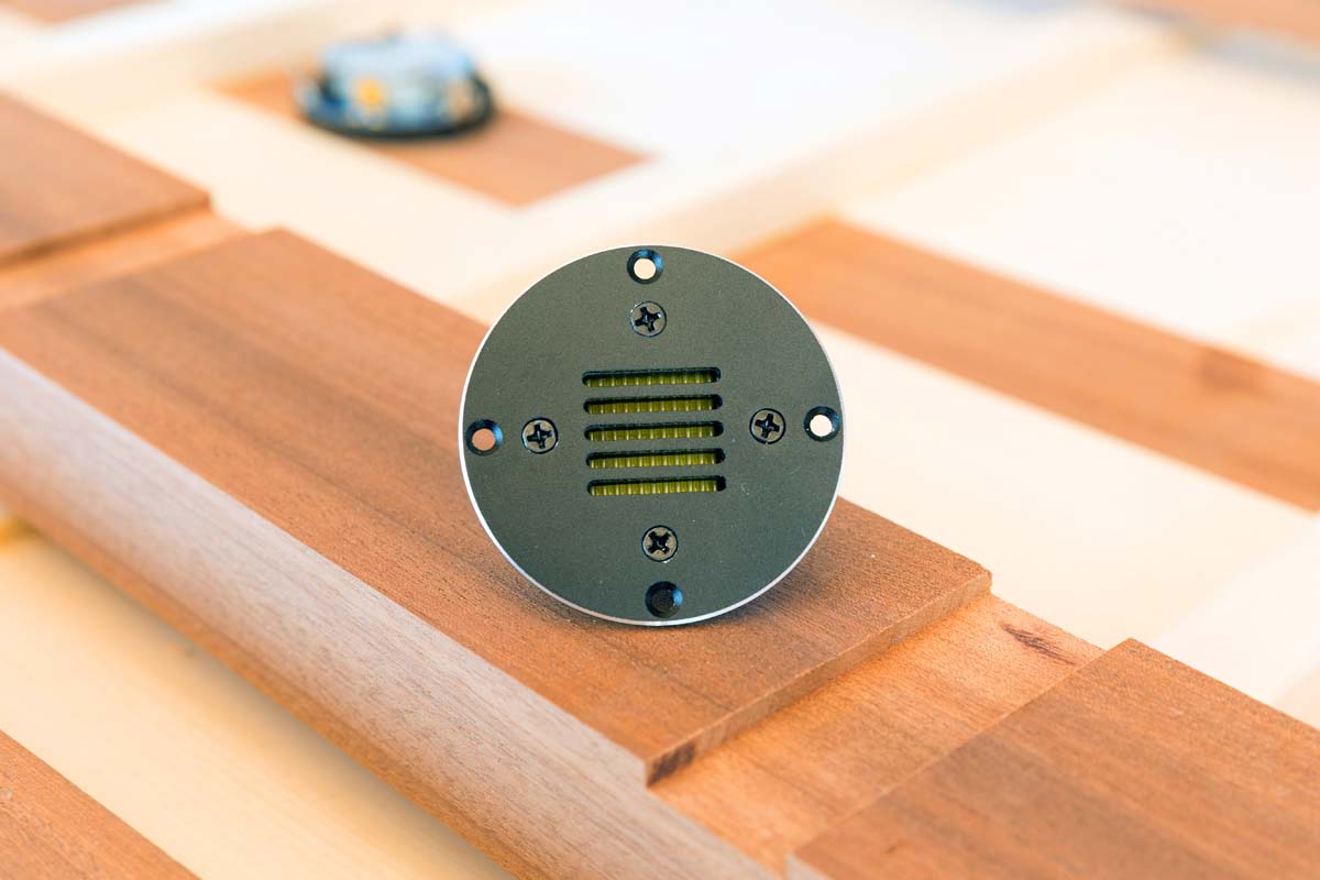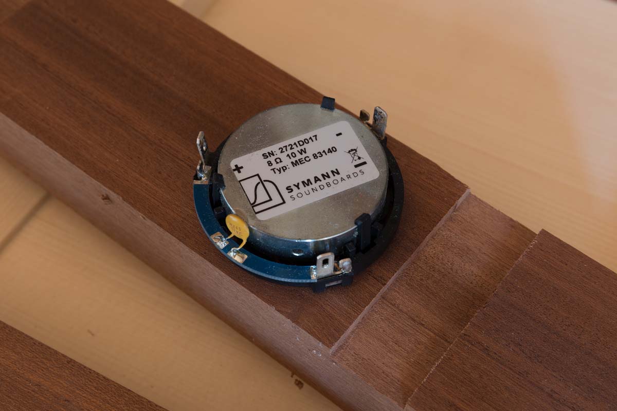 Frequenzweichen benötigen die Soundboards nicht, erläutert Michael Symann. Er bediene sich einer Technik aus dem Klavierbau: Die aus mehreren Teilen bestehenden Paneele, die er für die Vorder- und Rückseite seiner Lautsprecher verleimt, sind im oberen Bereich relativ stark und verjüngen sich nach unten. Die Frequenzen liefen durch das Holz und fänden von ganz allein ihre bevorzugten Wandstärken, erklärt der Klavierbaumeister. Bässe etwa mögen dünne, weiche Schichten, die ihnen nachgeben und einen gewissen Hub mitmachen. Höhen dagegen verlangen harte Flächen, bevorzugen deshalb die stabileren Wandbereiche. Je drei Exciter sitzen in jeder der vier sanft gewölbten, innen verstrebten Schallwände – die DSB-170 sind beidseitig identisch aufgebaut, strahlen gleichphasig nach vorn und hinten ab. Man erkennt die Positionen der Exciter relativ einfach, da sie mit Metallstiften, die man als silbrige Ringe ausmachen kann, Holz verankert werden. Relativ weit oben ist nur an der Frontseite je ein Air-Motion-Transformer verbaut, der die Wiedergabe nach Art und Manier eines Superhochtöners ab 12 Kilohertz vervollständigt. Verbunden sind die beiden Schallwände der DSB durch Decke und Boden sowie zwei seitlich verleimte Zargen, die mithilfe einer Metallstange verspannt sind. Letztere vermeidet Resonanzen und sorgt dafür, dass Schwingungen nur über die Schallflächen abgestrahlt werden.
