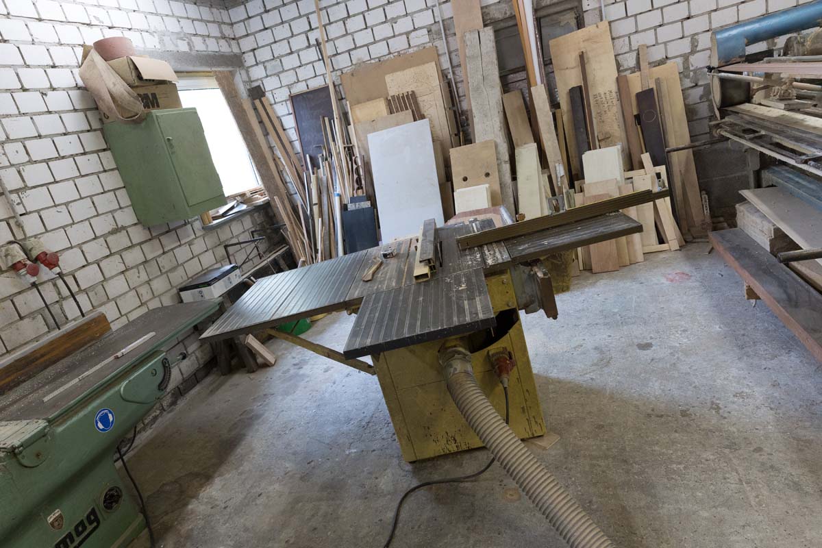 Damit führt mich der Hausherr weiter über den Hof in eine ausgebaute Garage, die seine Schreinerei, einen Lackierraum und die zuvor erwähnte Metallwerkstatt beheimatet. Dort wartet eine weitere, noch ziemlich roh wirkende Schallwand der DSB-136. Nach kurzer Vorbereitung beginnt Michael Symann, die sechs verleimten Rippen in ihre endgültige Form zu fräsen. Erst jetzt wird mir bewusst, dass jede Rippe etwas anders aussieht, die Fräse nach jedem Arbeitsschritt neu eingestellt werden muss. Die Rippen hätten mit ihrer Flexibilität Anteil an der Schallverteilung auf der Membranfläche. Neben langen Ruhezeiten zum Aushärten des Leims liege es vor allem an solchen Details, dass er Wochen benötige, um ein Paar Lautsprecher zu fertigen.