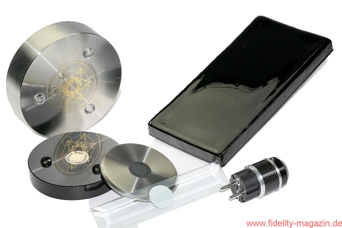 Es gibt viele Biophotone-Produkte für audiophile Anwendungen, in höchst unterschiedlichen Formen, Farben und Materialien. Rund und eckig, dick und dünn, aus Edelstahl, Schwarzglas und in Pulverform. Zum Draufstellen, Drunterlegen, An-die-Wand-Hängen, Aufkleben, Dranheften und Stapeln, zum Einstecken (in die Steckdose) und zum Umwickeln (von Kabeln). Es gibt sogar noch viel mehr Produkte, die ein komplett biophotonisiertes Leben ermöglichen, bis hin zu Salzen und Wasser, aber das nur am Rande. Ich persönlich akzeptiere für den Musikgenuss nur äußere Anwendung.